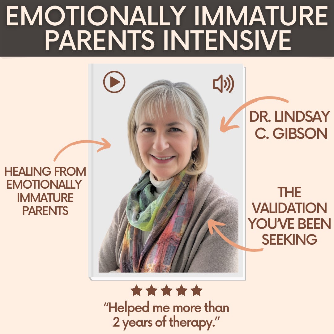 Hello friend, thank you so much for taking time out of your day to read my article, it really means a lot to me! If it resonated with you, I suspect you’ll find great value in the Emotionally Immature Parents Intensive, a course I created in collaboration with Dr. Lindsay C. Gibson, author of the best-selling book Adult Children Of Emotionally Immature Parents.